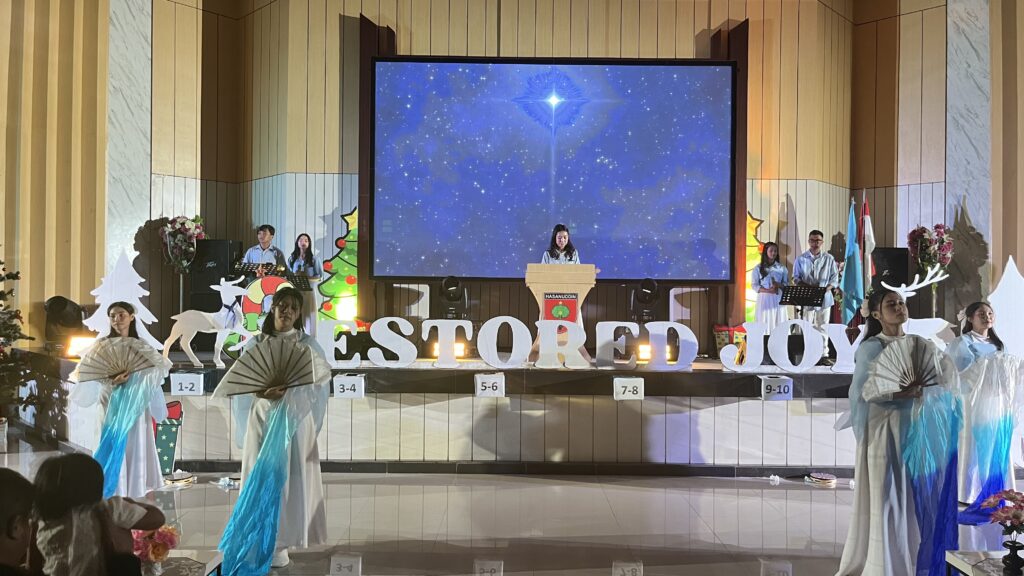 Selamat merayakan Natal! Dengan tema ‘Restored Joy’, kita bersyukur atas kehadiran Sang Terang yang membawa harapan baru bagi dunia. Ibadah Natal ini mengingatkan kita untuk terus memancarkan cahaya kasih-Nya dalam setiap langkah hidup kita. Semoga terang-Nya menyinari hati kita dan membawa kedamaian bagi setiap jiwa.”